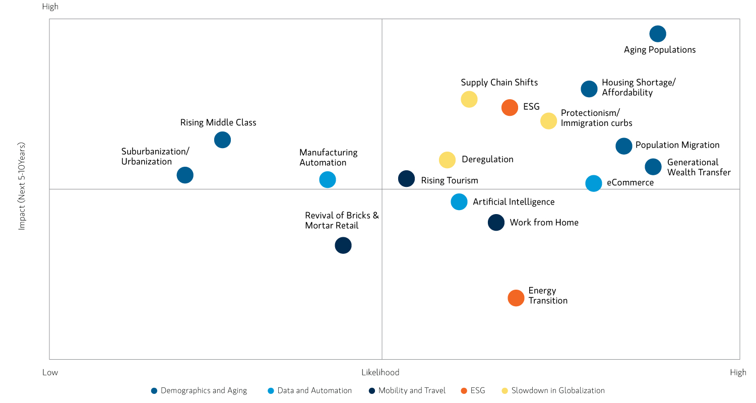 We are closely monitoring geopolitical developments, macroeconomic indicators, and interest rate trends. Our focus includes demographic shifts, supply chain realignments, and uneven recovery patterns across regions, markets, sectors, and asset types. We are tracking changes in structural demand drivers—such as on-shoring and near-shoring, ESG priorities, technological adoption, and aging populations—and evaluating their impact on occupier preferences. Additionally, we are paying careful attention to investor sentiment, capital allocation trends, debt market dynamics, and evolving strategy preferences.